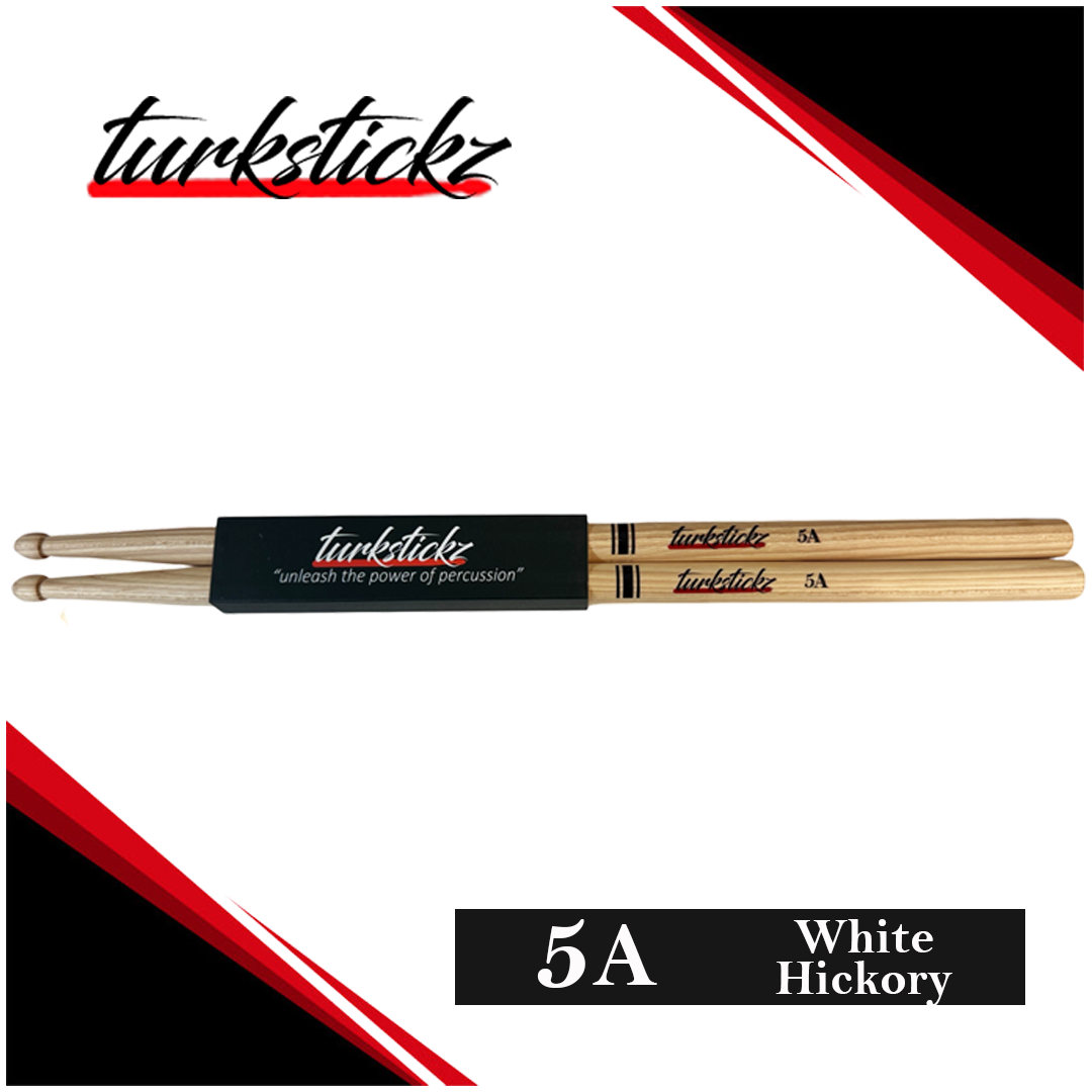 These sticks are turned from Select White Hickory. White hickory drumsticks are a popular type of drumstick made from the sapwood or outer portion of the hickory tree, which is lighter in color than the heartwood.  Known for a balanced feel—not too heavy or too light with good shock absorption, reducing stress on hands and wrists. Hickory is a dense and resilient wood, making these sticks durable and great for both practice and performance. The acorn tip produces an intense, rich cymbal sound and response.